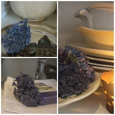 HAr en Hortensia buske som jag plockar av och binder kransar...denna gång tror jag att jag tog dem för tidigt annars torkar de super fint......har en kvar sen förra året är jättefin fortfarande...så de håller länge....
